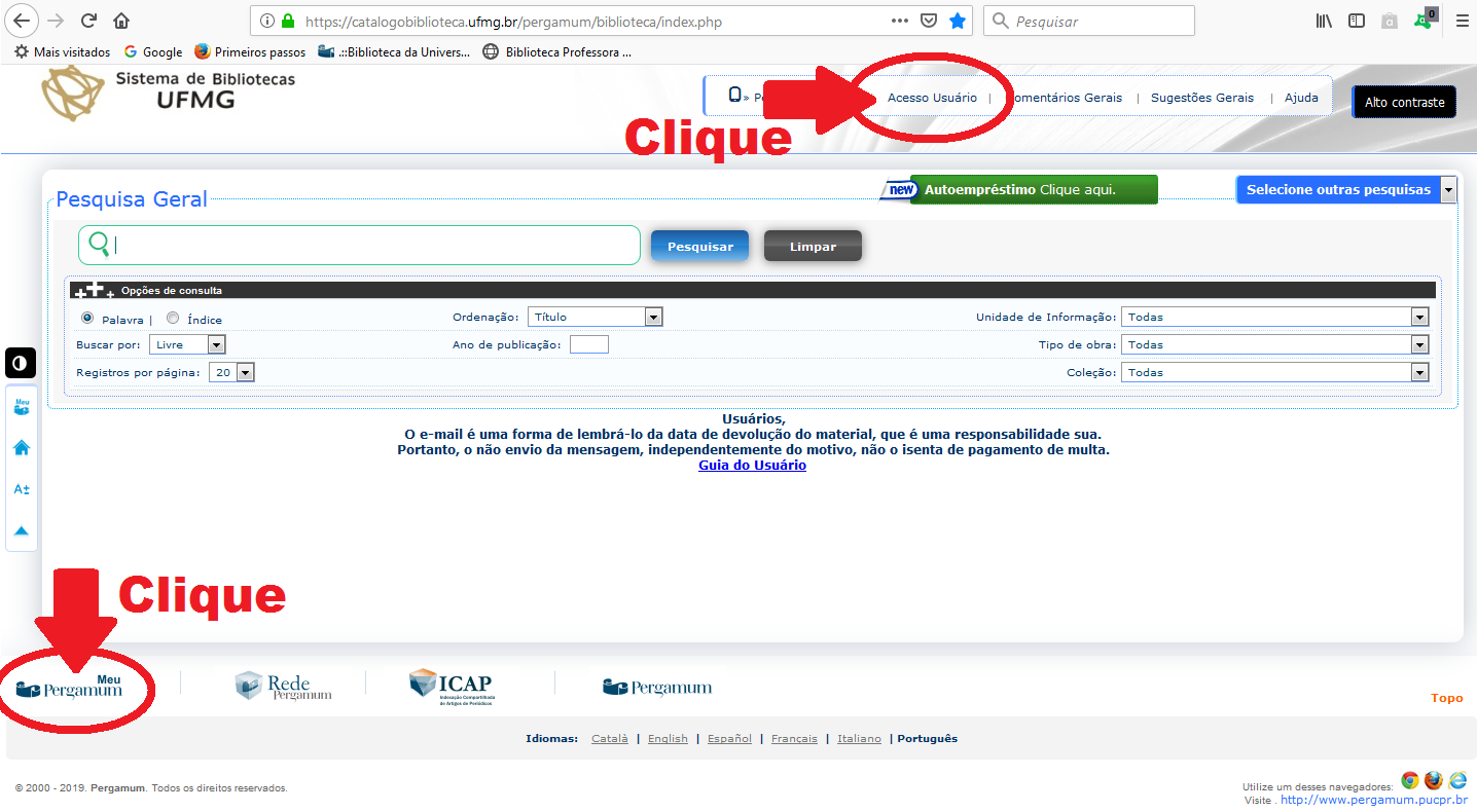 2) Na página de página de buscas no catálogo online clique em "Acesso Usuário", ou clique no ícone "Meu Pergamum"