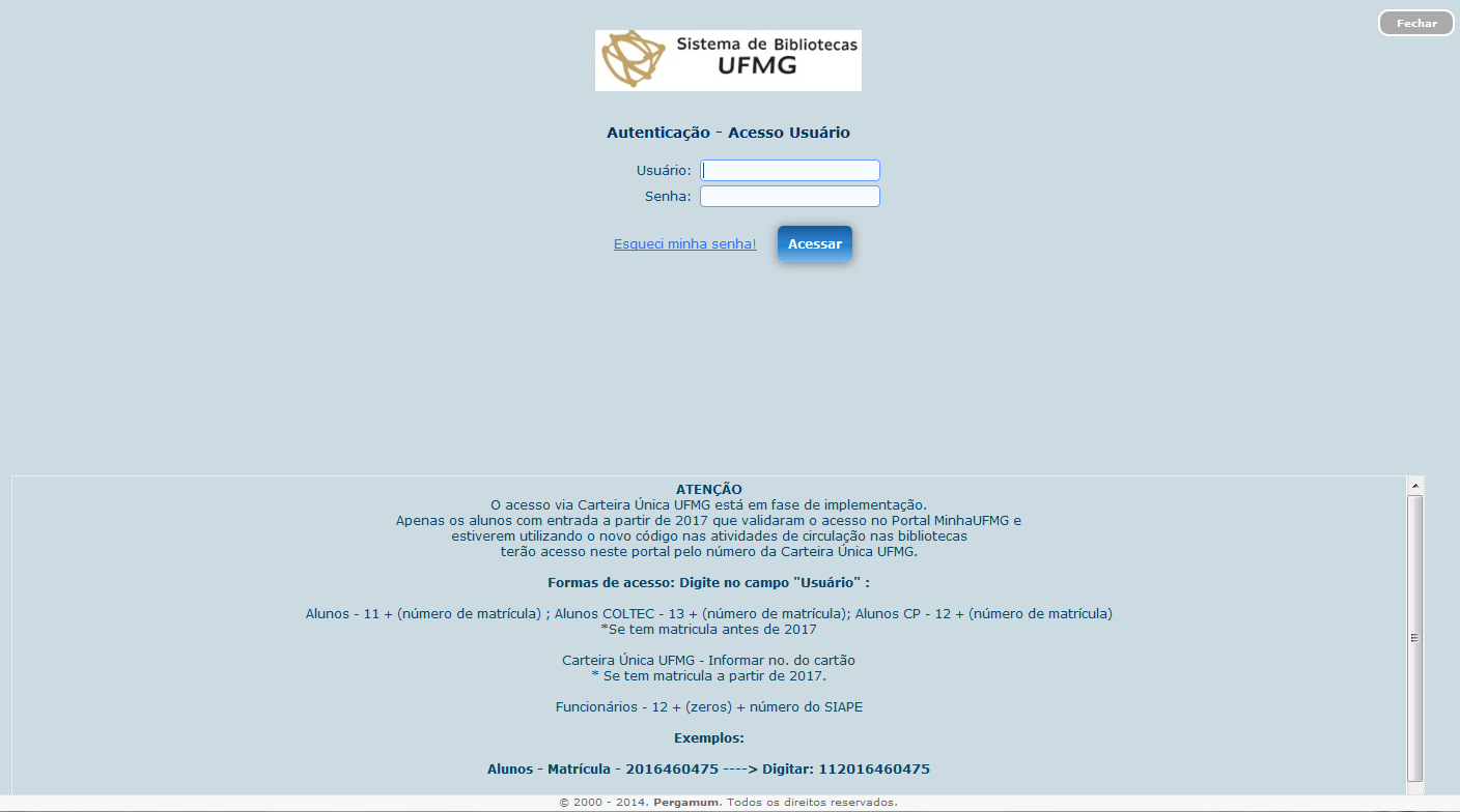 3.2) No campo usuário, digite o número da sua carteira única da UFMG, ou, 11 + seu número de matrícula. (Leia as informações na parte inferior da tela) 3.3) No campo senha, digite a senha que você utiliza para realização de empréstimos na biblioteca. (Atenção! não é a mesma senha utilizada no portal Minha UFMG) 4) Ao abrir a tela do sistema pergamum para usuários clique no menu "Empréstimo -> Débito".